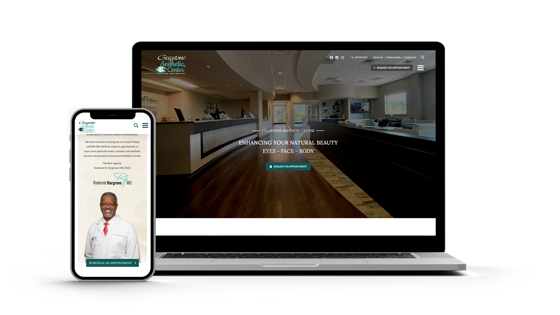 The new Graystone Aesthetics website (eyesfacebody.com) was designed as a fully custom, fully featured website that: